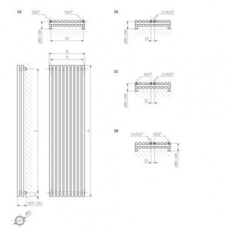 * Wyposażenie: odpowietrznik, konsole mocujące MKT w komplecie z kołkami rozporowymi. W wersji poziomej przy podłączeniach ZP lub ZL wbudowano wkładkę termostatyczną odpowiednio po prawej lub lewej stronie. Przy podłączeniu dolnym ZP lub ZL zasilanie bliżej środka.