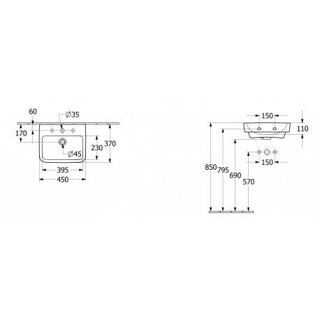 Villeroy & Boch > Sanitary ceramics > Hanging washbasins > O.Novo > Wall-hung washbasin Villeroy & Boch O.novo, 45x37cm, without overflow, battery hole, Weiss Alpin AntiBac CeramicPlus