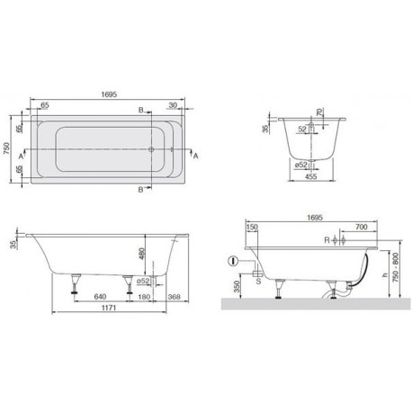 Wanna bez kompletu nóżek montażowych. Wymagany system odpływowy przedłużany.