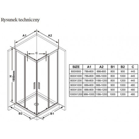 Wysokość wyrobu wynosi 1900 mm. Zalecane brodziki: Aneta Basic, Perseus, Perseus Pro, Perseus Pro Flat, Perseus Pro Chrome, Gigant, Gigant Pro, Gigant Pro Flat, Gigant Pro Chrome lub odpływ liniowy bądź kratka odpływowa. Na zdjęciu widoczne są drzwi prysznicowe zamontowane z brodzikiem. Elementy te należy zakupić osobno.